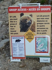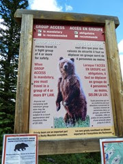 We liepen er wat omheen, nog steeds in goed weer maar met op de achtergrond al wat donkere wolken. Voor het eerst zagen we ook een verbod om met minder dan vier personen aan de wandel te gaan vanwege de grizzlies. Meestal is dat alleen maar een aanbeveling.