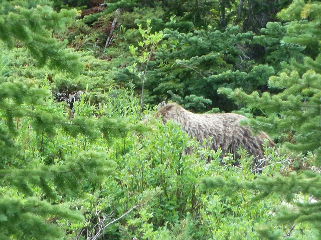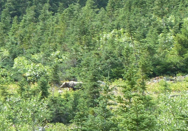 Het kostte ons moeite ons weer los te rukken van dit hoogstandje van moeder natuur maar dat deden we op een goed moment toch. Hoe goed dat moment was bleek tien minuten nadat we in de auto op weg naar beneden zaten. Een paar mensen langs de kant, geen wonder want het uitzicht naar het dal was schitterend. Alleen….ze keken niet naar het dal maar naar de berg. Ja, dan weet je het al: wild! En verdomd, echt vlakbij ons liep de eerste beer van deze vakantie. Geen gewone zwarte, nee, meteen een grizzlie! Het leek een vrij jong exemplaar, maar we zijn natuurlijk geen experts. Er stopten steeds meer auto’s en iedereen wachtte totdat er weer iemand riep ‘Dáár! Dáár!’ en dan holden we met z’n allen weer een stukje verder, camera’s in de aanslag. Het dier liep jammer genoeg steeds meer van ons af, en op een goed moment lieten we hem maar z’n gang gaan. Onze dag kon nu helemáál niet meer stuk.