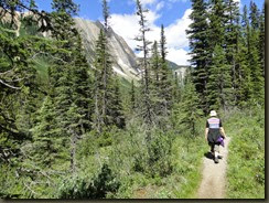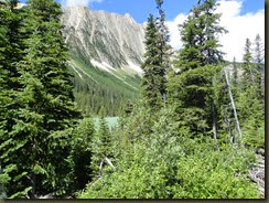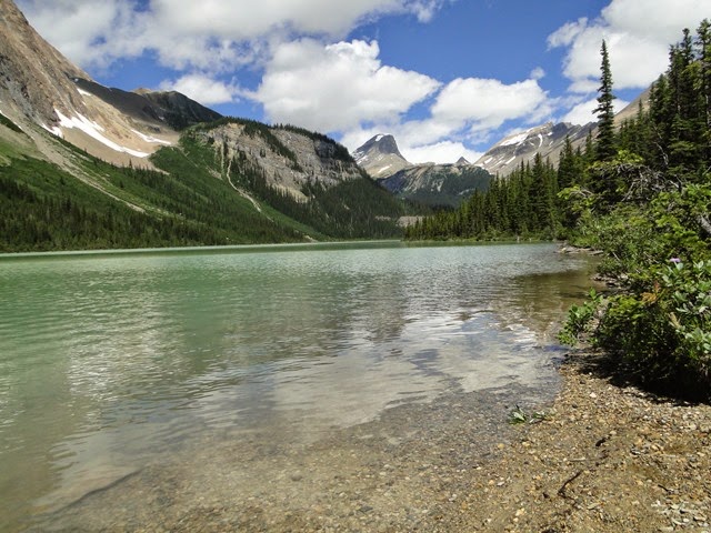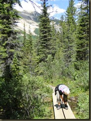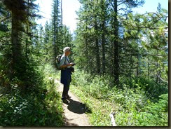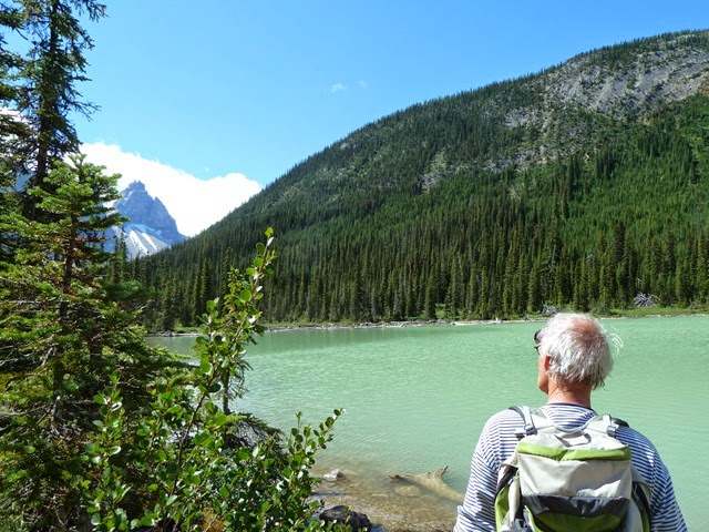 Het eerste agendapunt was een trail naar het Sherbrooke Lake. Dit is een bergmeer waar niet heel veel mensen naartoe lopen. De grote publiekstrekker hier is Lake O’Hare, waar een bus naartoe rijdt. Je kunt dan ter plekke zelf verder wandelen naar bijvoorbeeld Lake Arthur, maar dat zijn pittige tochten met veel hoogteverschillen. Vanwege het weer was dit alles geen optie. Bovendien moet je die bus drie maanden van tevoren bespreken, en dat past totaal niet in ons vrijheid-blijheid plaatje. Je kunt er overigens ook te voet heen, elf kilometer is nu niet het einde van de wereld, maar dan loop je over een gravelpad en in de file. De allervriendelijkste Ranger in het VC, hij leek erg op Jerry uit Cheers, had ons dan ook de andere mogelijkheid gewezen. Het was een wandeling van een uur of drie, en dat liet ons de ruimte ‘s middags nog andere dingen te gaan bekijken.