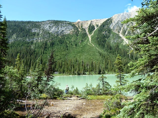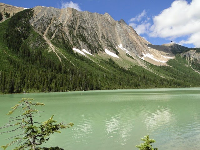 Er lagen veel dode bomen die door met het smeltende ijs van de gletsjers meegesleurd waren naar beneden. Erachter bevond zich het langgerekte meer. Zoals bijna alle bergmeren groenblauw van kleur, en omzoomd door morenen op de flanken van de bergen. Er was niemand. We liepen een eind langs de oevers, op kleine drassige paadjes, erg onder de indruk van dit natuurschoon.