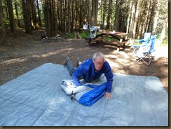 In de buurt van Radium Hot Springs zochten we een hotel. De bergen om ons heen werden inmiddels al rijkelijk voorzien van water zodat we maar liever hoog en droog zaten. In het plaatsje, ook weer een publiekstrekker van jewelste vanwege de warmwaterbaden, rezen de prijzen echter de pan uit. We probeerden het een plaatsje enkele mijlen verderop, bij het enige hotel dat daar te vinden was, een Super8. Maar ook dáár logen de prijzen er niet om. Dan maar weer terug, en nog iets meer hotels vragen. We kwamen langs een campground in het Provincial Park, Dry Gulch. Toch maar even kijken. Prachtig! Goed en ruim aangelegd, een fonkelnieuw sanitairblok en plaats genoeg. Hoewel we nog even twijfelden vanwege de dreigende lucht besloten we de gok te nemen. Dan maar een natte tent. Slapen konden we desnoods wel in de auto.